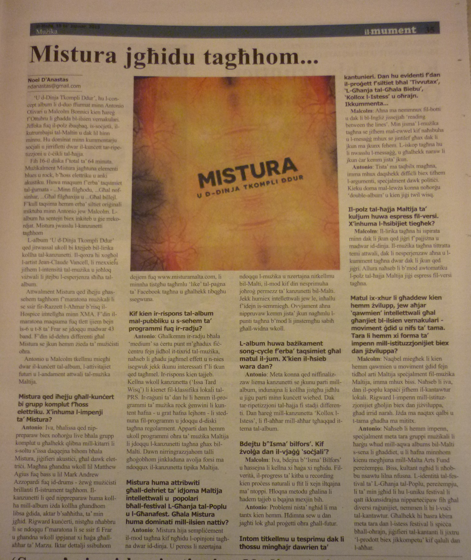 Mistura jgħidu tagħhom… 18/01/201518/01/2015 / A / Leave a comment Din hija intervista magħna li qed tidher illum il-Ħadd 18 ta’ Jannar 2015 fuq il-Mument. Grazzi bħal dejjem lil Noel D’Anastas li mill-bidu nett wera nteress fil-mużika tagħna u baqa’ jsegwina. Ikklikkja biex taqraha: